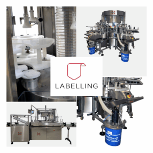 Systems can be configured with different labeling stations (cold glue, hot glue, roll-fed, or self-adhesive) and equipped with mechanical or optical orientation devices for precise positioning.
