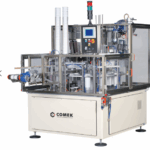 Rotary step machine with reduced dimensions and productive capacity up to 4,500 pieces/hour. Suitable for stackable plastic or laminated paper containers.
